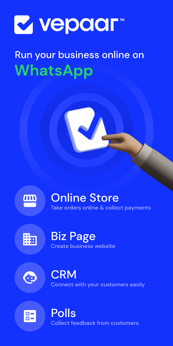 Vepaar เป็นแอปพลิเคชัน Android ฟรีที่พัฒนาโดย 7Span ที่ช่วยให้ผู้ใช้สามารถจัดการธุรกิจทั้งหมดของพวกเขาบน WhatsApp ได้ มันมีคุณสมบัติหลากหลาย เช่น ร้านค้าดิจิตอล โพล และ CRM ซึ่งช่วยให้ผู้ใช้สามารถดำเนินธุรกิจของพวกเขาได้อย่างราบรื่น ด้วย Vepaar ผู้ใช้สามารถสร้างหน้าธุรกิจแบบเพียงแค่แตะหน้าจอเดียว ตั้งค่าแคตตาล็อกสินค้า แชร์สินค้าบน WhatsApp หรือแพลตฟอร์มโซเชียลอื่น ๆ จัดการคำสั่งซื้อ รวมเกตเวย์การชำระเงิน และดูรายงานการขายบนแดชบอร์ดได้ แอปพลิเคชันยังมีฟีเจอร์ QuickSend ที่ช่วยให้ผู้ใช้สามารถส่งข้อความไปยังหมายเลขใด ๆ โดยไม่ต้องบันทึกไว้ในรายชื่อผู้ติดต่อของพวกเขา Vepaar เหมาะสำหรับธุรกิจขนาดเล็ก เช่น ร้านขายผักหรือผลไม้ ร้านขายของชำ ร้านปลาและเนื้อสัตว์ ร้านอาหาร ผู้ขายสินค้า Instagram และร้านเสื้อผ้า